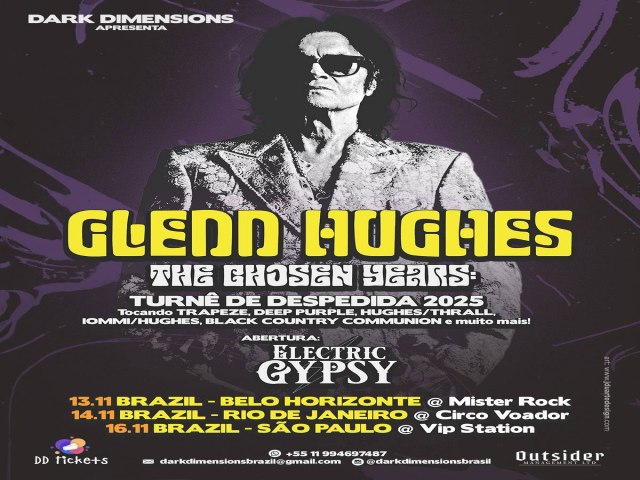 Com realização da produtora Dark Dimensions (*), a turnê de despedida do lendário músico inglês Glenn Hughes — uma das vozes mais marcantes da história do rock mundial — chega à América do Sul em novembro desse ano, em uma série de 11 shows imperdíveis que celebram mais de cinco décadas de carreira em uma despedida histórica.